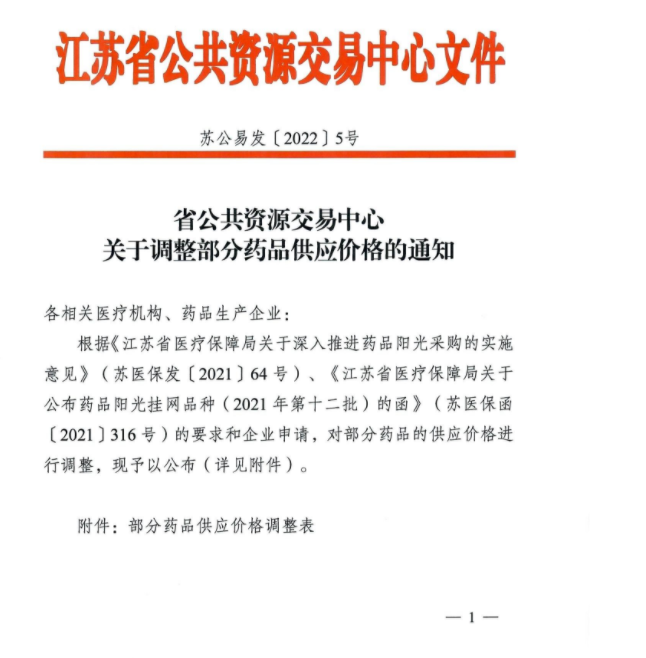 【江苏】江苏省公共资源交易中心关于调整部分药品供应价格的通知(20220104)