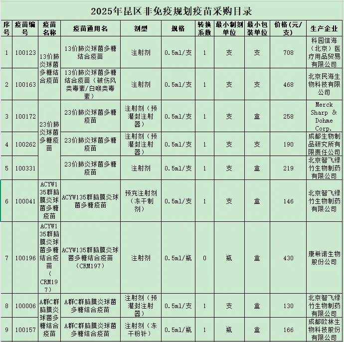 采购领导小组遵循科学评估、集体决策,公开、公平、公正的原则,按照《昆区非免疫规划疫苗采购实施方案》,从《内蒙古自治区非免疫规划类疫苗网上招采平台》集中挂网的“非免疫规划疫苗采购目录”范围内遴选出2025年昆区非免疫规划疫苗采购目录,现公示如下。