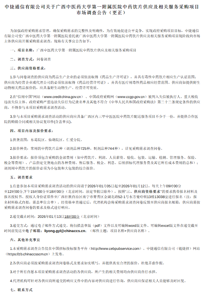 【广西中医药大学第一附属医院】广西壮族自治区中捷通信有限公司关于广西中医药大学第一附属医院中药饮片供应及相关服务采购项目市场调查公告(更正)