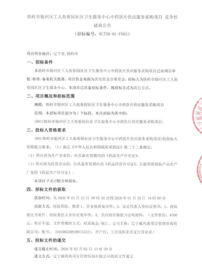 【铁岭市银州区工人街春园社区卫生服务中心】辽宁省铁岭市银州区工人街春园社区卫生服务中心中药饮片供应服务采购项目竞争性磋商公告