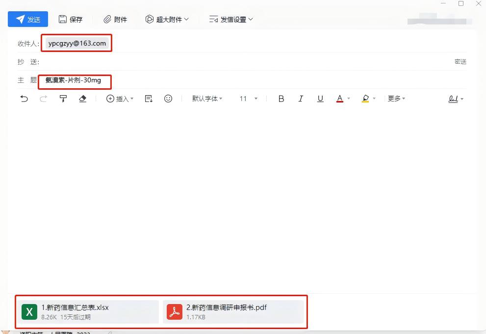 仅接收附件1和附件2的电子版资料。将上述资料发送到指定邮箱ypcgzyy@163.com。主题:药品名-剂型-规格。资料以附件形式按要求上传,如图: