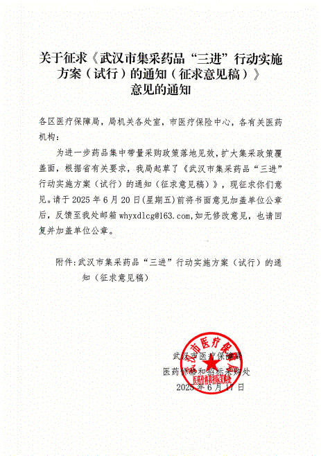 【武汉】关于征求《武汉市集采药品“三进”行动实施方案(试行)的通知(征求意见稿)》意见的通知