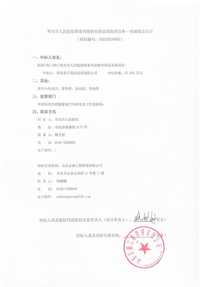 【潍坊市寿光市人民医院】山东省寿光市人民医院锝系列放射性药品采购项目单一来源成交公示