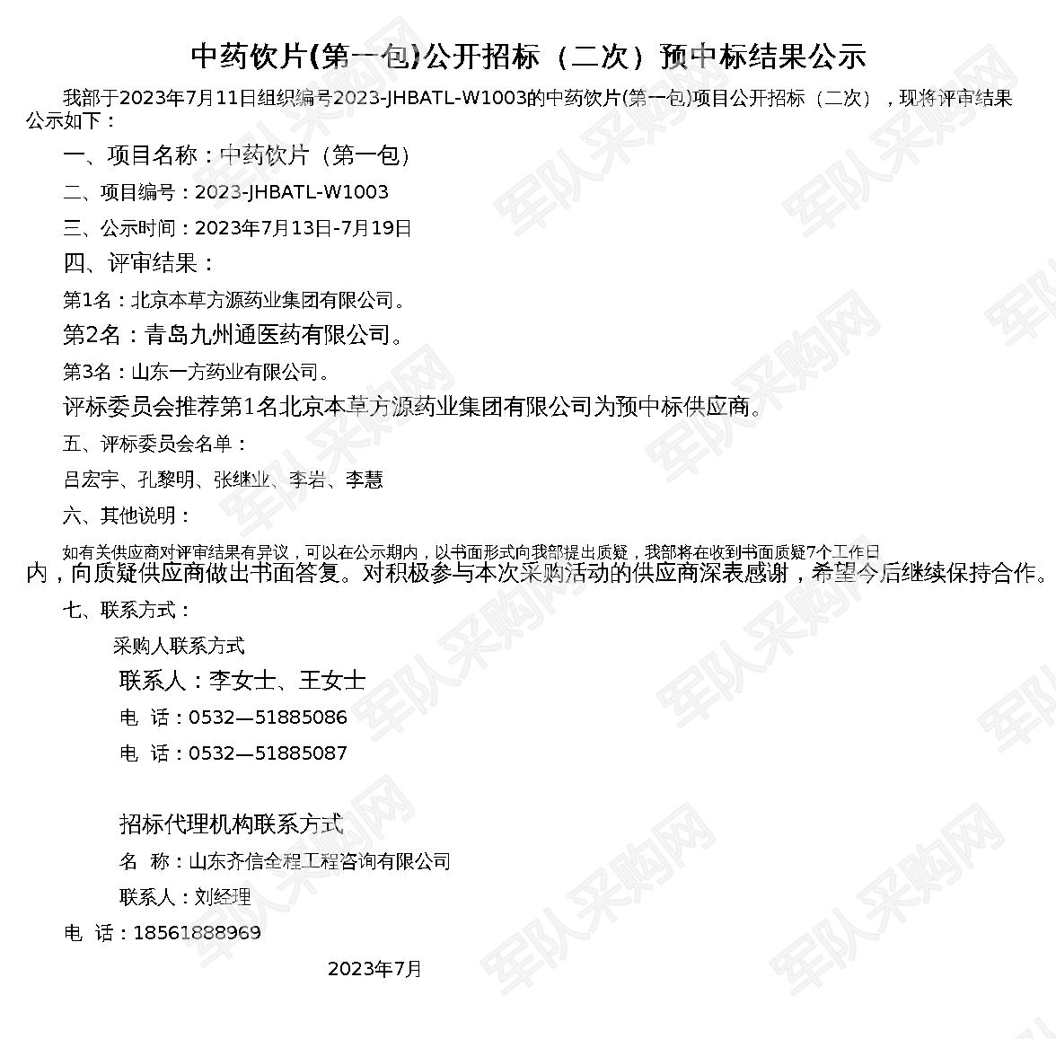 【军队采购】军队采购网中药饮片(第一包)公开招标(二次)预中标结果公示(2023-JHBATL-W1003)