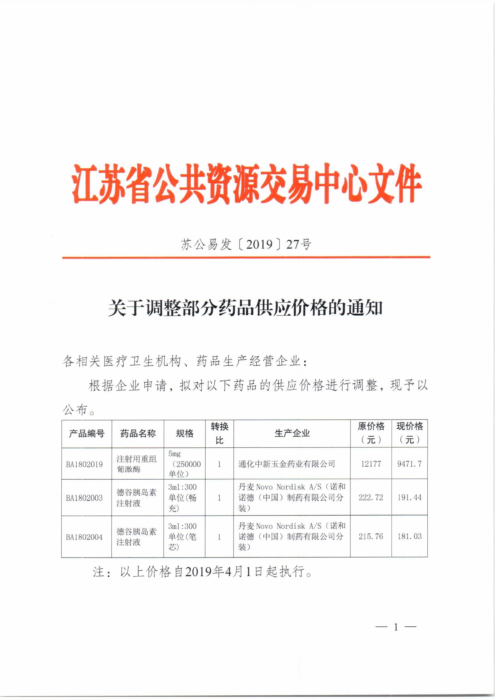 【江苏】江苏省关于调整部分药品供应价格的通知(20190328)