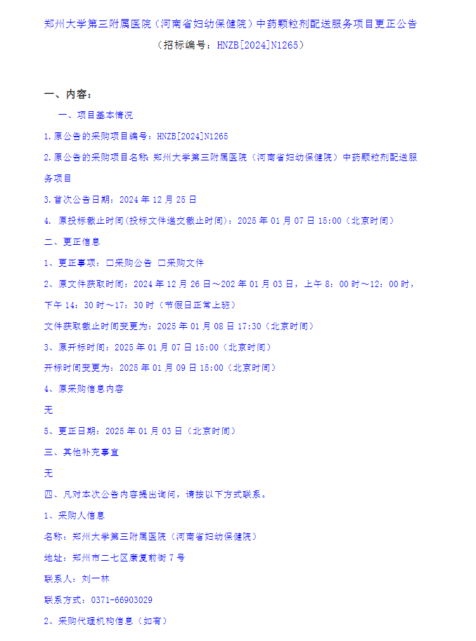 【郑州大学第三附属医院】河南省郑州大学第三附属医院(河南省妇幼保健院)中药颗粒剂配送服务项目更正公告