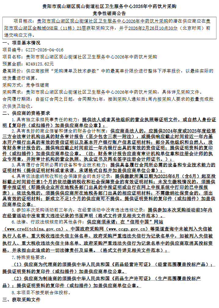 【贵阳市观山湖区观山街道社区卫生服务中心】贵州省贵阳市观山湖区观山街道社区卫生服务中心2026年中药饮片采购竞争性磋商公告