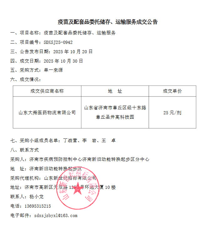 【济南市疾病预防控制中心】山东省济南市疾病预防控制中心济南新旧动能转换起步区分中心疫苗及配套品委托储存、运输服务成交公告
