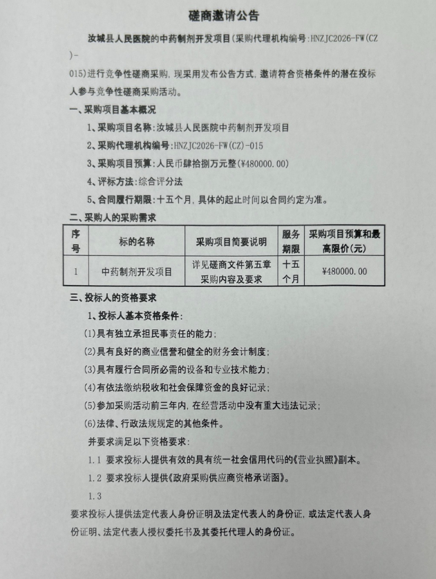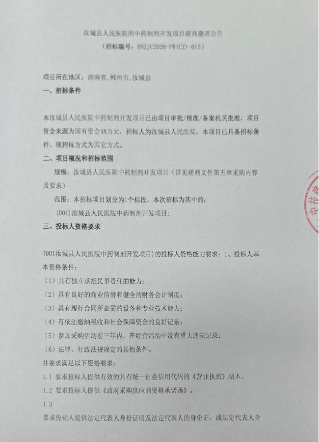 【郴州市汝城县人民医院】湖南省郴州市汝城县人民医院的中药制剂开发项目磋商邀请公告