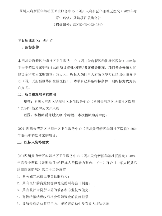 【成都市天府新区华阳社区卫生服务中心】四川天府新区华阳社区卫生服务中心(四川天府新区华阳社区医院)2024年临采中药饮片采购项目采购公告