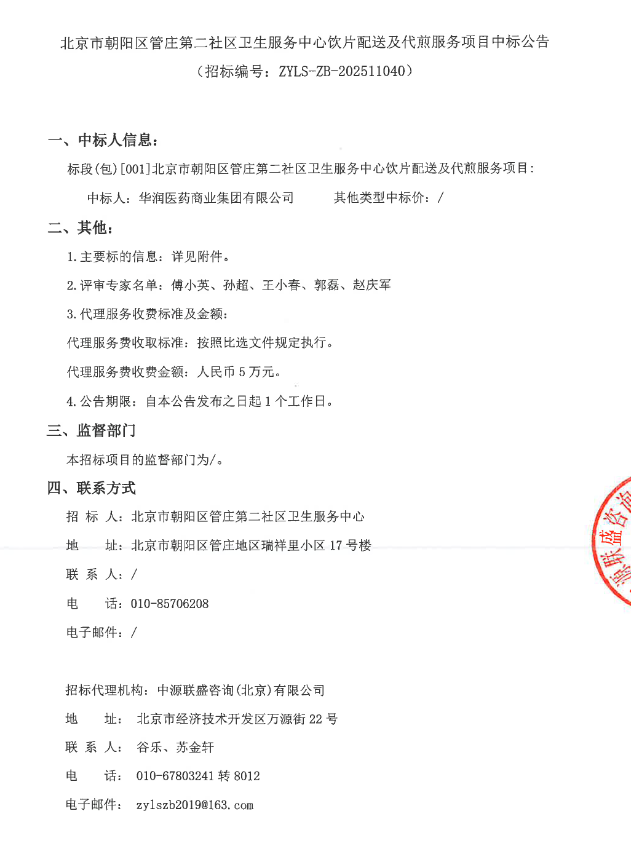 【北京市朝阳区管庄第二社区卫生服务中心】北京市朝阳区管庄第二社区卫生服务中心饮片配送及代煎服务项目中标公告