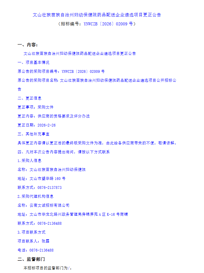 【文山壮族苗族自治州妇幼保健院】云南省文山壮族苗族自治州妇幼保健院药品配送企业遴选项目更正公告1