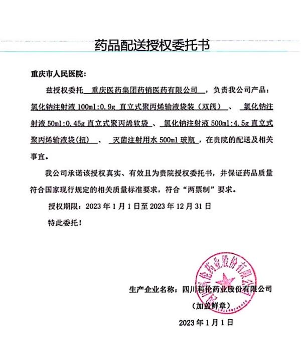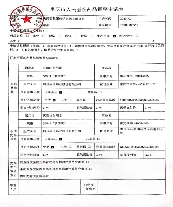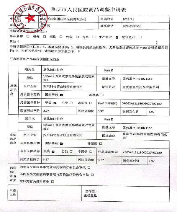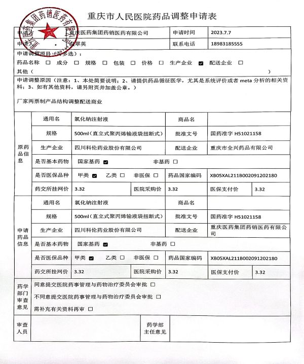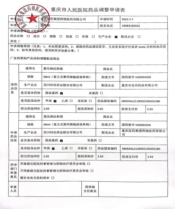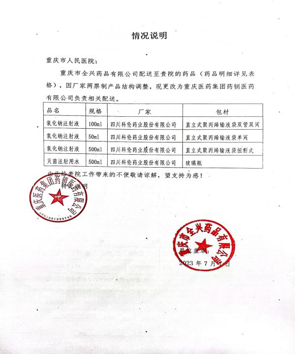 重庆市全兴药品有限公司配送至我院的氯化钠注射液(100ml,直立式聚西烯软袋双管双阀)等4个品种,因厂家两票制产品结构调整,拟变更配送商业公司。依据重庆市人民医院药物治疗与药事管理委员会会议要求,经原配送和拟变更配送公司协商,现拟变更为重庆医药集团药销医药有限公司负责相关配送,相关情况说明材料予以公示,详见附件。