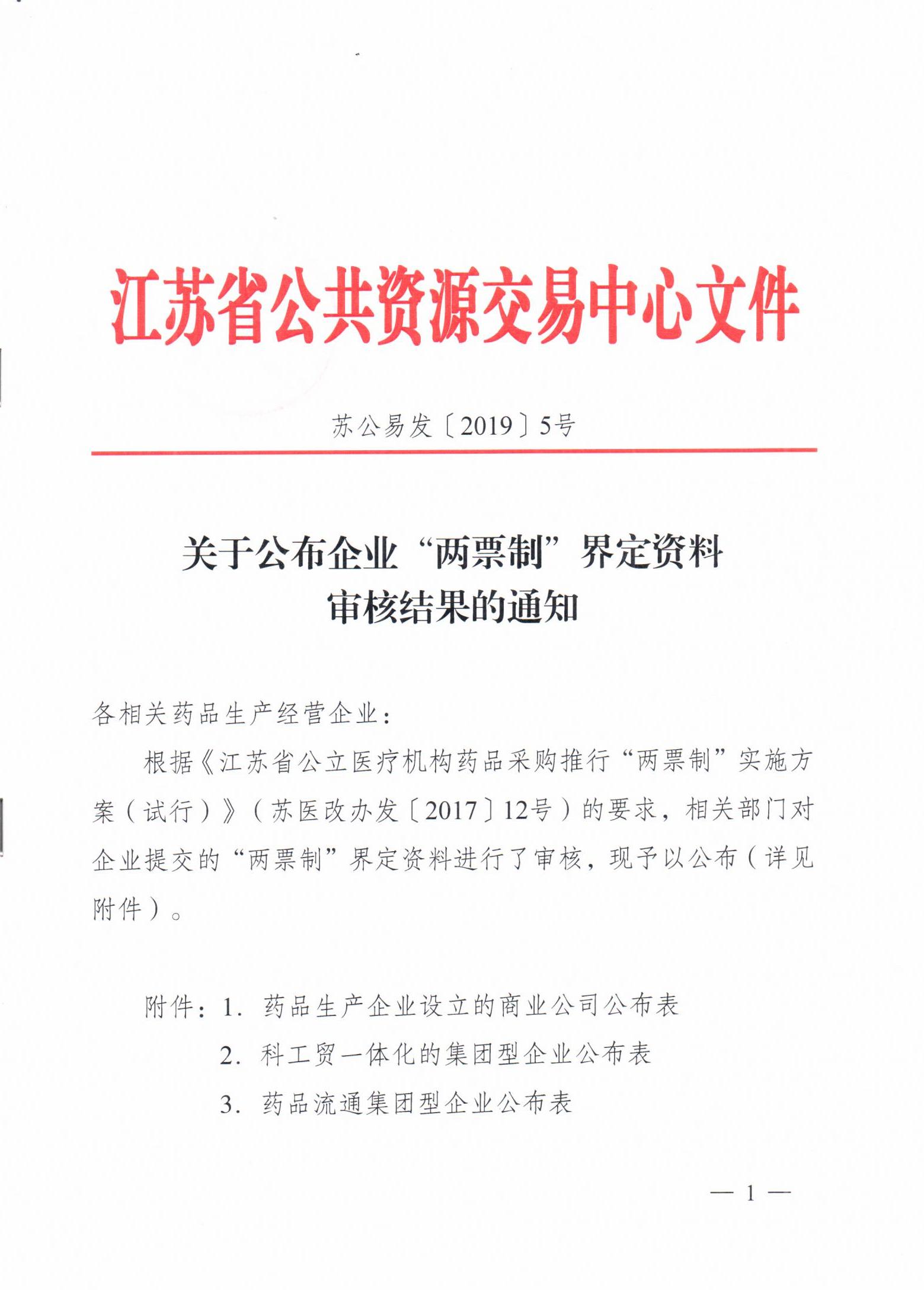 【江苏】江苏省关于公布企业“两票制”界定资料审核结果的通知(20190109)