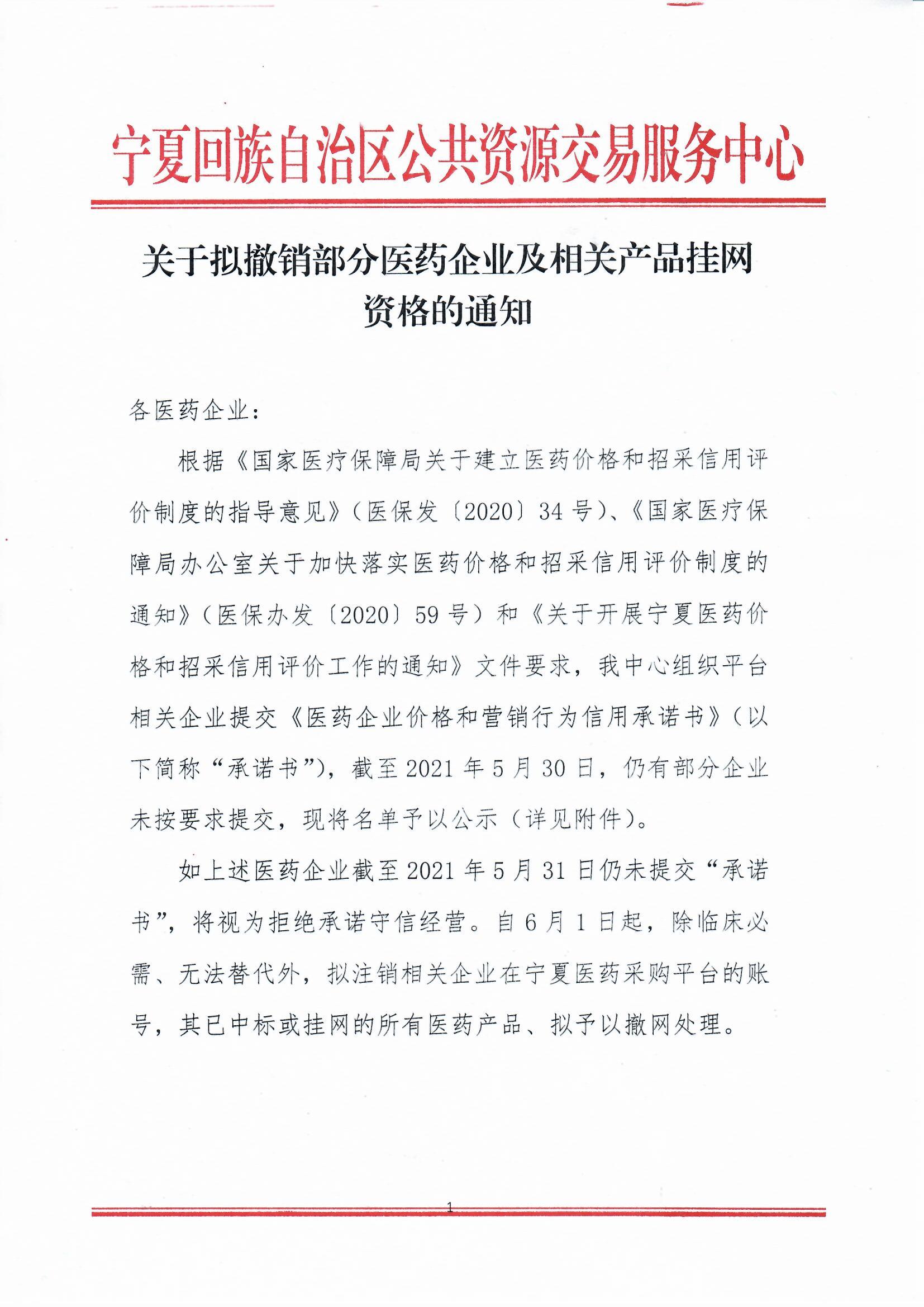 【宁夏】2021年宁夏自治区关于拟撤销部分医药企业及相关产品挂网资格的通知