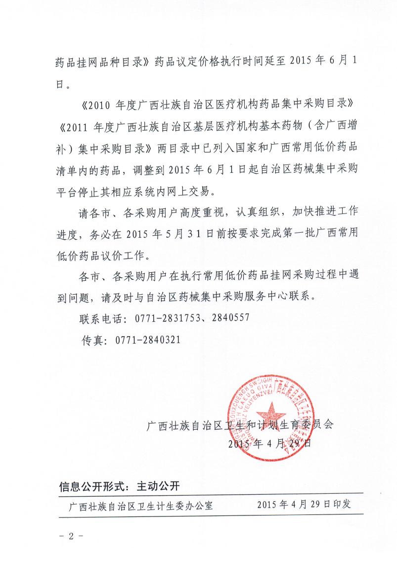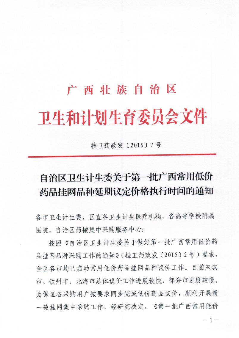 【广西壮族自治区】自治区卫生计生委关于第一批广西常用低价药品挂网品种延期议定价格执行时间的通知