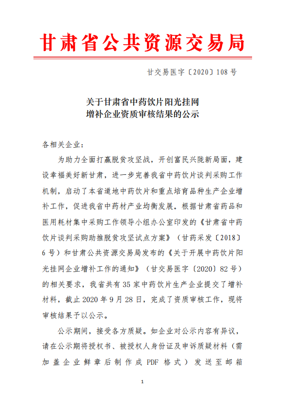 【甘肃】关于甘肃省中药饮片阳光挂网增补企业资质审核结果的公示