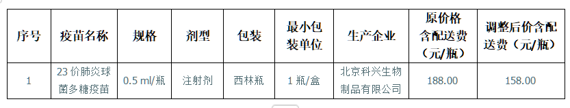 根据《江西省疫苗集中采购方案》要求和企业递交申请,北京科兴生物制品有限公司递交调价函件,对23价肺炎球菌多糖疫苗价格调整,现予以公示(详见表1)。