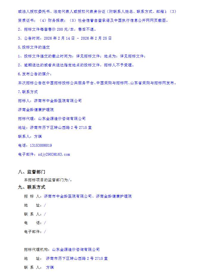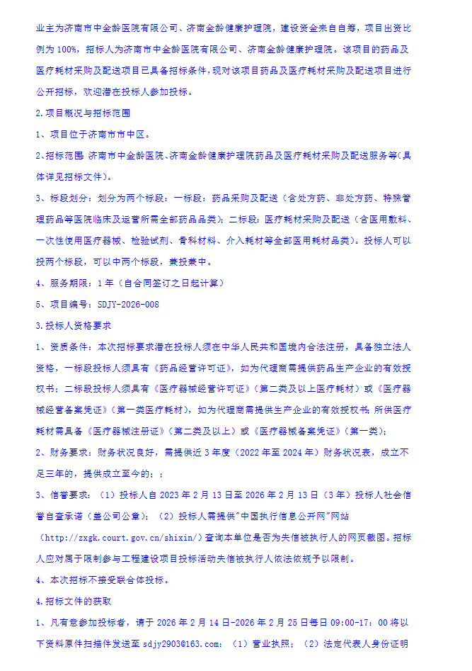 【济南市中金龄医院】山东省济南市中金龄医院、济南金龄健康护理院药品及医疗耗材采购及配送项目招标公告