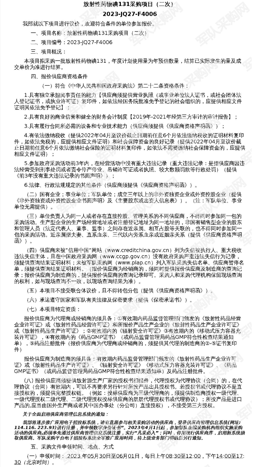 【军队采购】军队采购网放射性药物碘131采购项目(二次)+2023-JQ27-F4006