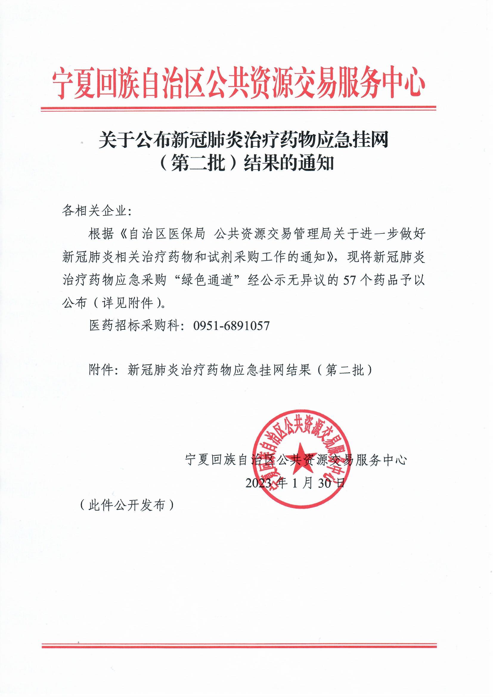【宁夏】关于公布新冠肺炎治疗药物应急挂网(第二批)结果的通知