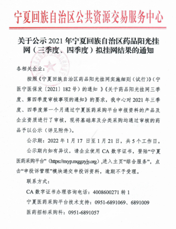 【宁夏】关于公示2021年宁夏回族自治区药品阳光挂网(三季度、四季度)拟挂网结果的通知