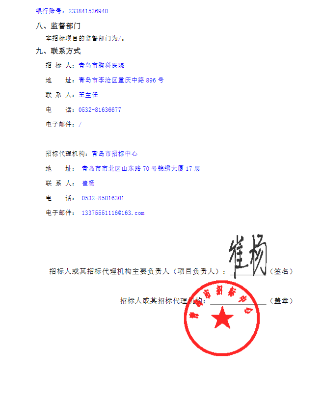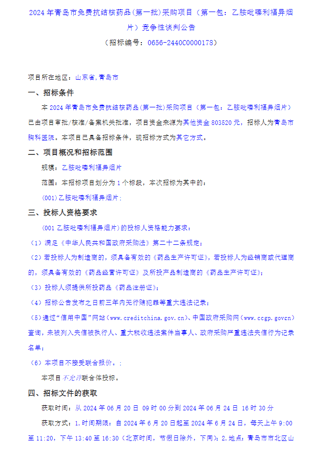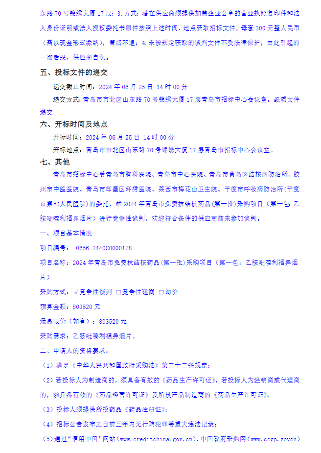 【青岛市胸科医院】山东省2024年青岛市免费抗结核药品(第一批)采购项目(第一包:乙胺吡嗪利福异烟片)竞争性谈判公告