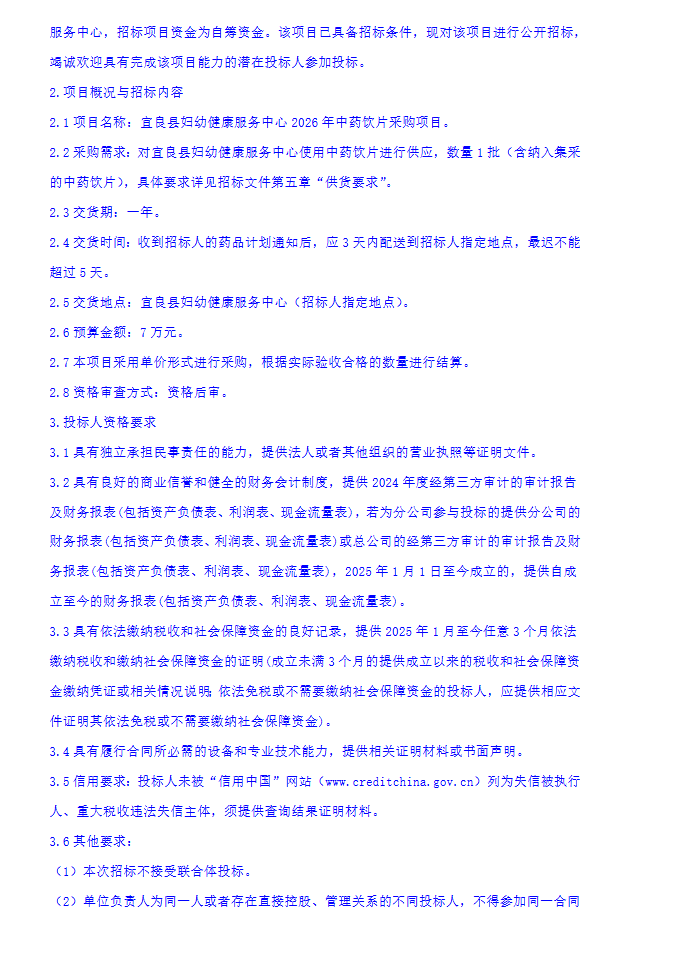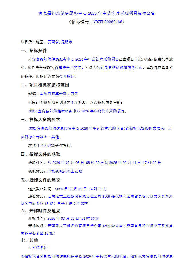 【昆明市宜良县妇幼健康服务中心】云南省昆明市宜良县妇幼健康服务中心2026年中药饮片采购项目招标公告