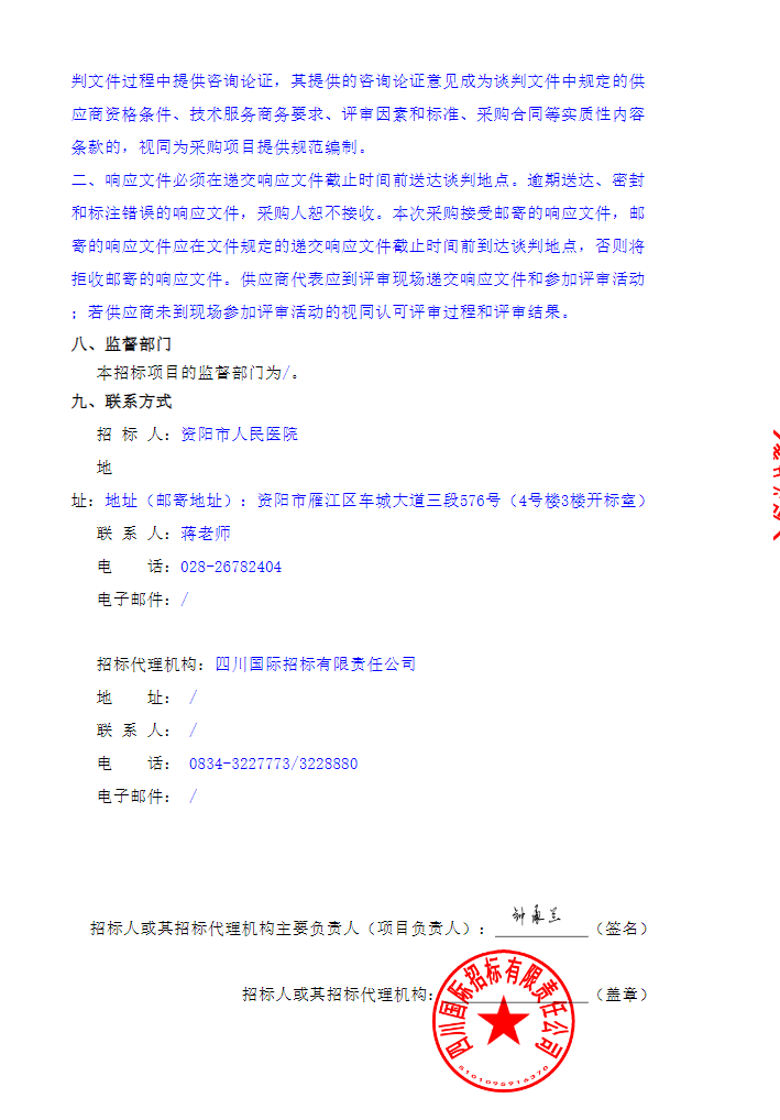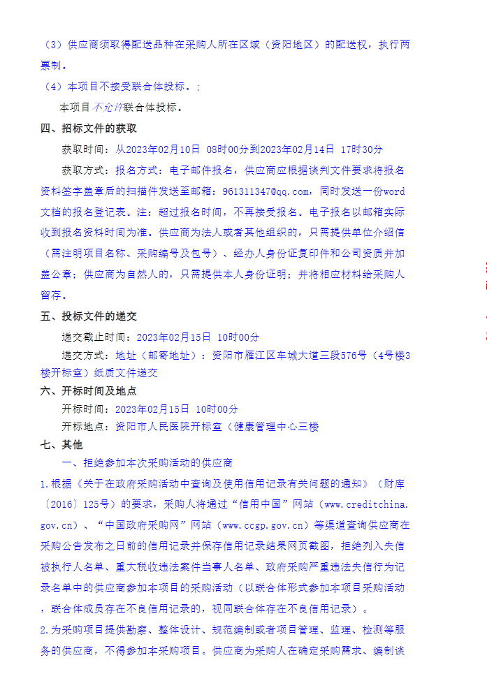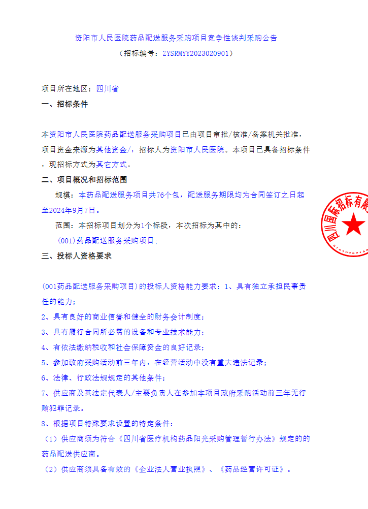 【资阳市人民医院】四川省资阳市人民医院药品配送服务采购项目竞争性谈判采购公告