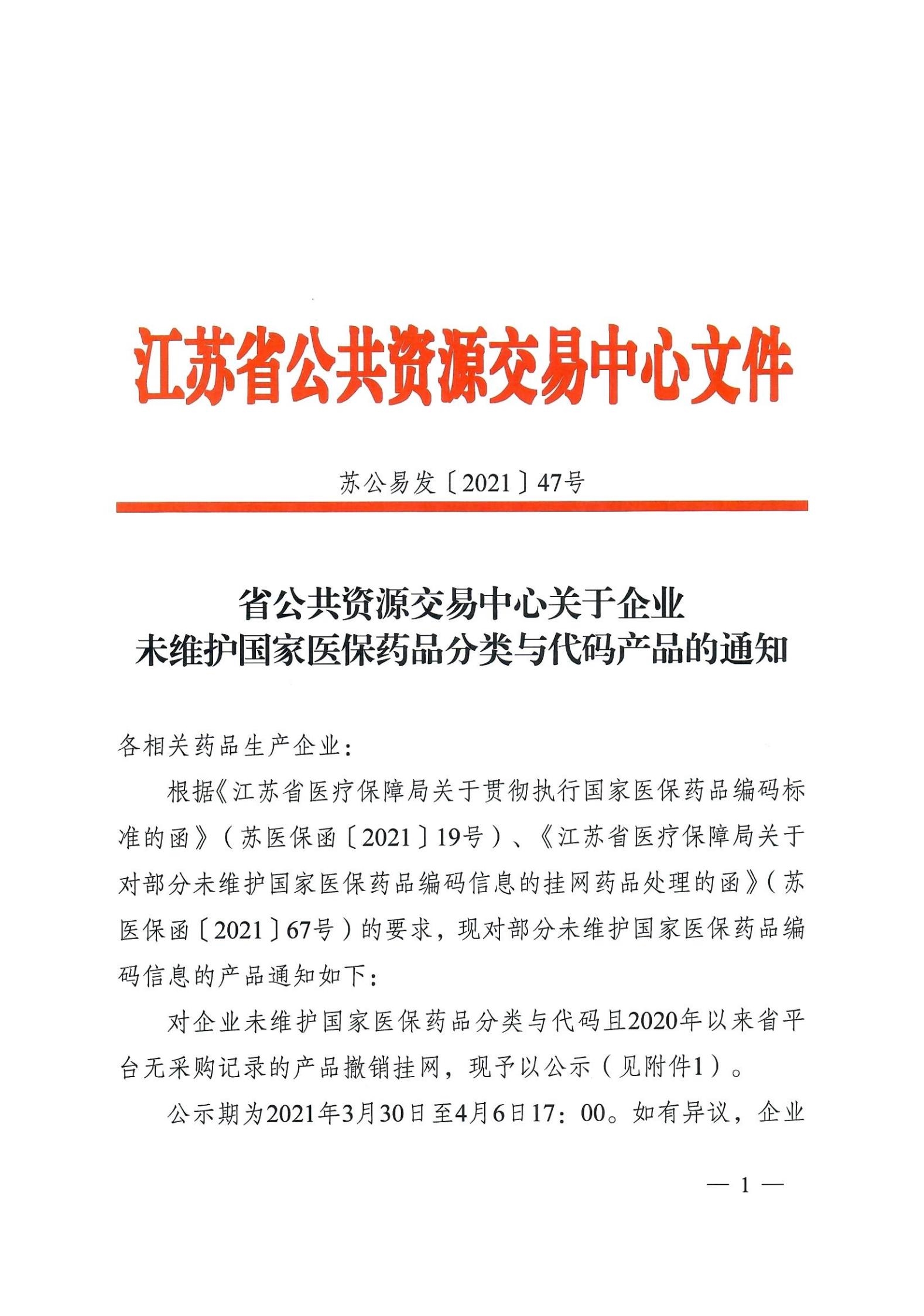 【江苏】2021年江苏省公共资源交易中心关于企业未维护国家医保药品分类与代码产品的通知 苏公易发[2021]47号