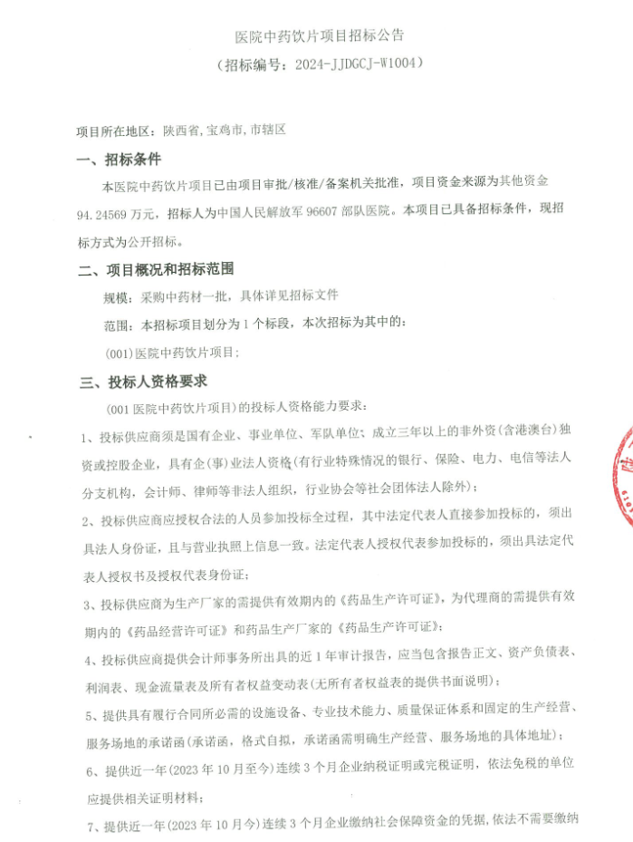【军队采购】军队医院中药饮片项目招标公告
