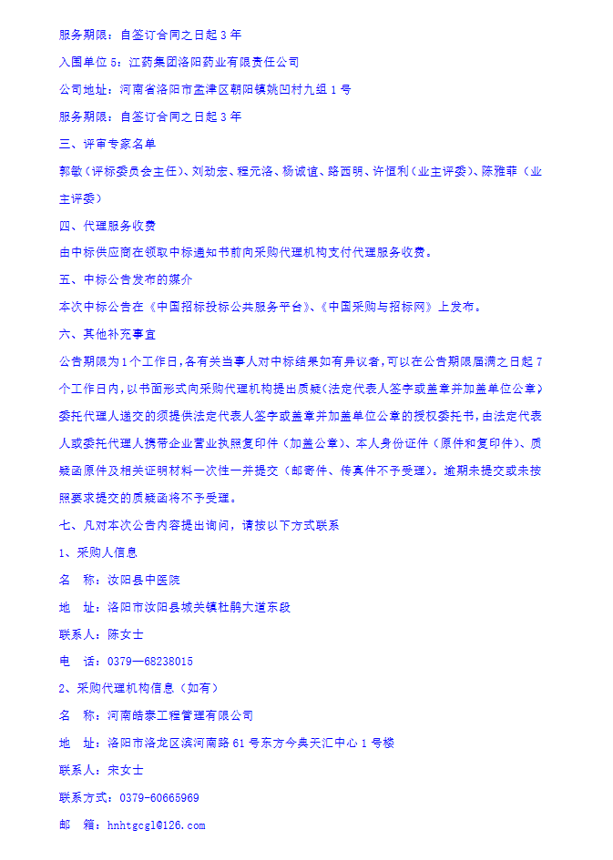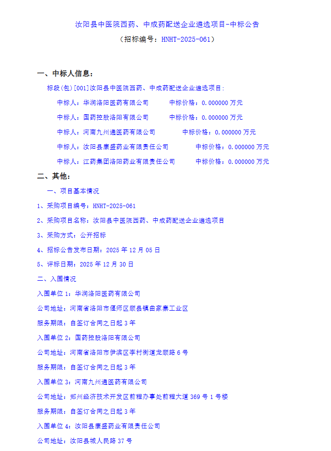 【洛阳市汝阳县中医院】河南省汝阳县中医院西药、中成药配送企业遴选项目-中标公告