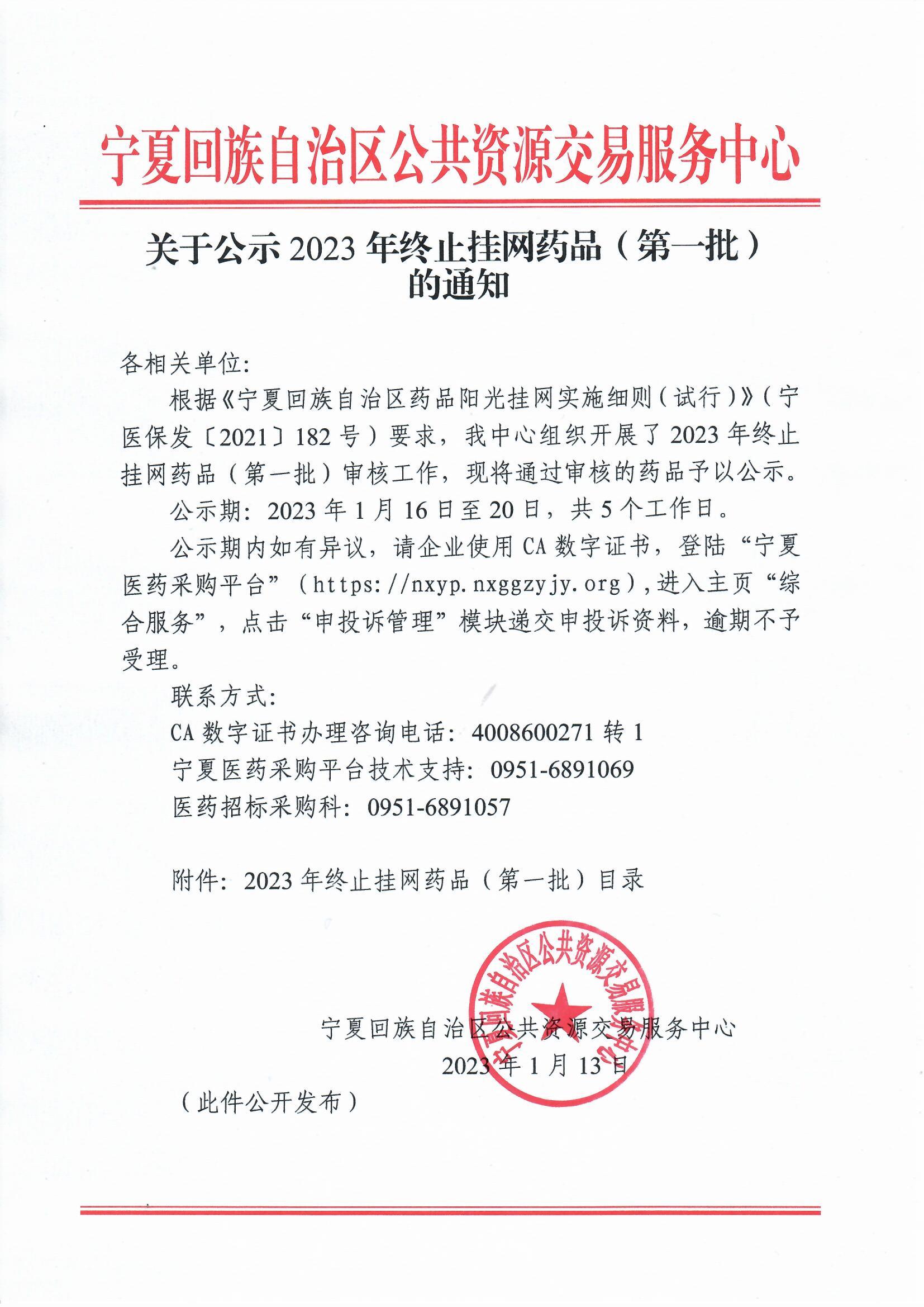 根据《宁夏回族自治区药品阳光挂网实施细则(试行)》(宁医保发〔2021〕182号)要求,我中心组织开展了2023年终止挂网药品(第一批)审核工作,现将通过审核的药品予以公示。公示期:2023年1月16日至20日,共5个工作日。公示期内如有异议,请企业使用CA数字证书,登陆"宁夏医药采购平台"(https://nxyp.nxggzyjy.org),进入主页"综合服务",点击"申投诉管理"模块递交申投诉资料,逾期不予受理。