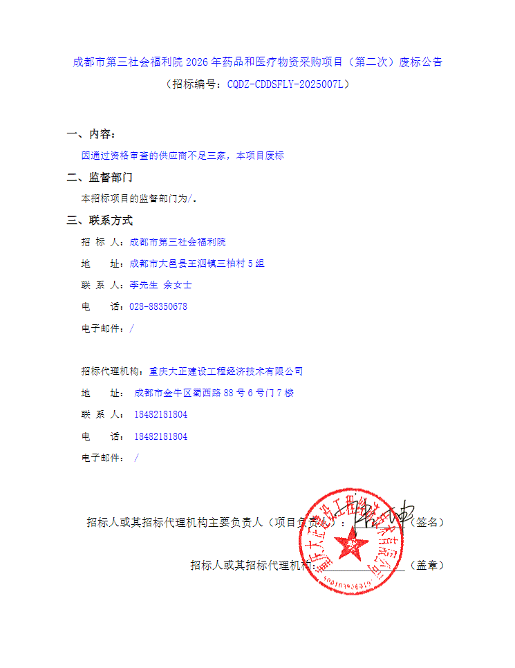 【成都市第三社会福利院】四川省成都市第三社会福利院2026年药品和医疗物资采购项目(第二次)废标公告