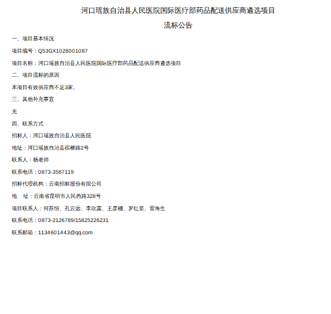 【昆明市安宁市河口瑶族自治县人民医院】云南省河口瑶族自治县人民医院国际医疗部药品配送供应商遴选项目流标公告