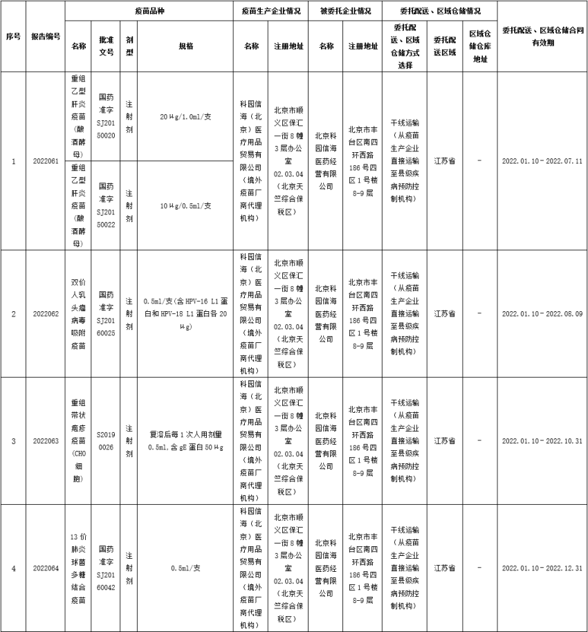 根据《食品药品监管总局 国家卫生计生委关于进一步加强疫苗流通监管促进疫苗供应工作的通知》有关规定,现将科园信海(北京)医疗用品贸易有限公司(境外疫苗厂商代理机构)的非免疫规划疫苗委托配送、区域仓储情况信息公告如下: