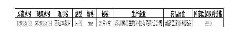 根据企业自主申请,现将深圳微芯生物科技有限责任公司 “西达本胺片”调整为“国家医保谈判药品”,并统一执行“36种国家医保谈判药品价格”(详见下表),请各医疗机构及时调整相关药品价格。