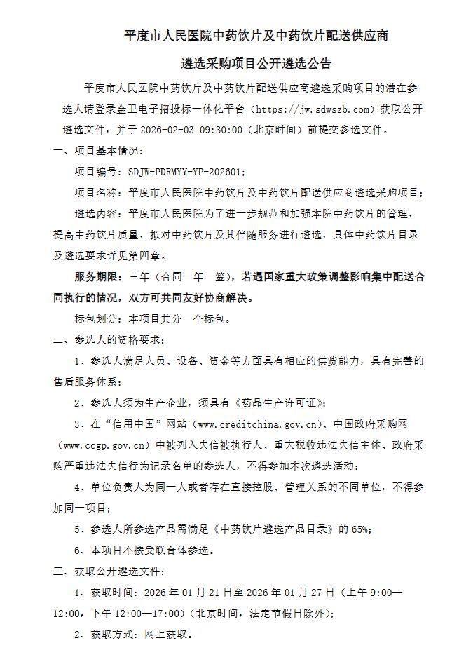 【青岛市平度市人民医院】山东省平度市人民医院中药饮片及中药饮片配送供应商遴选采购项目公开遴选公告