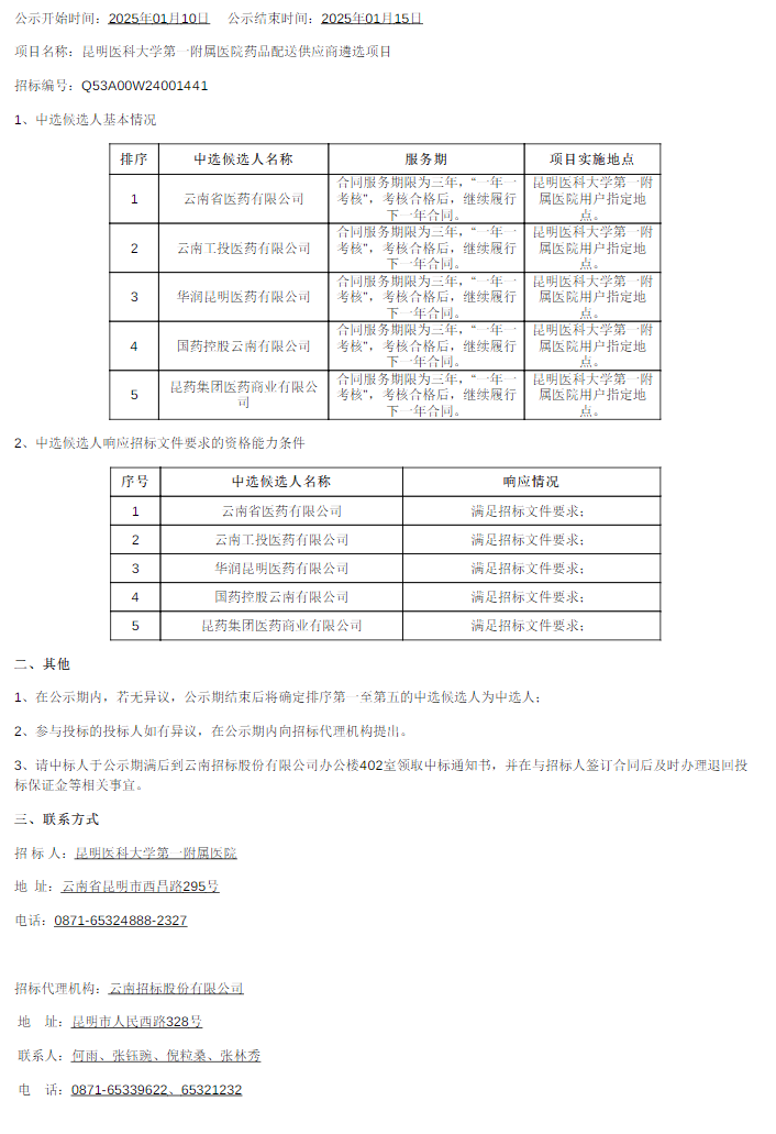 【昆明医科大学第一附属医院】云南省昆明医科大学第一附属医院药品配送供应商遴选项目招标结果公告