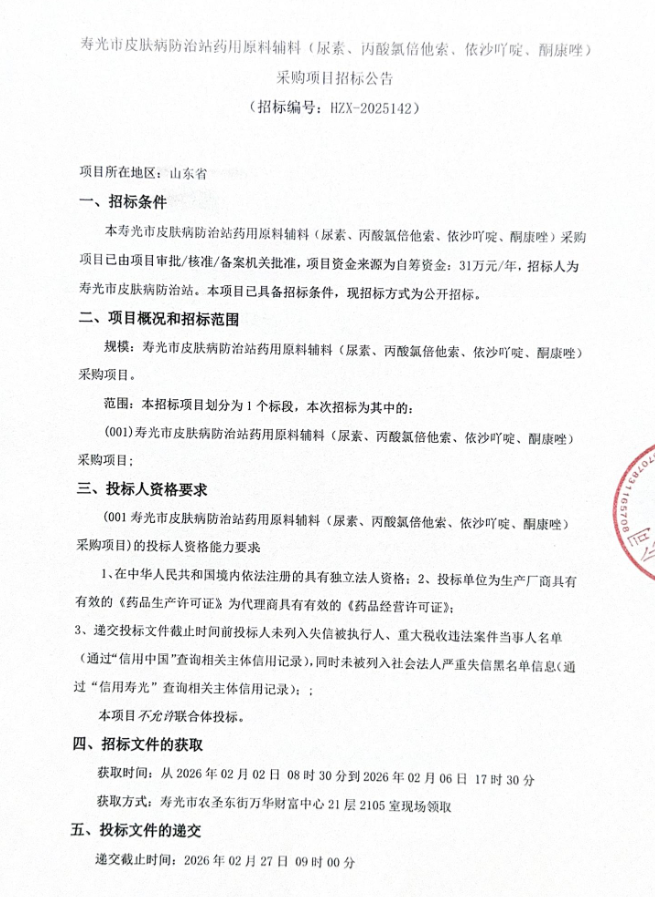 【潍坊市寿光市皮肤病防治站】山东省潍坊市寿光市皮肤病防治站药用原料辅料(尿素、丙酸氯倍他索、依沙吖啶、酮康唑)采购项目招标公告
