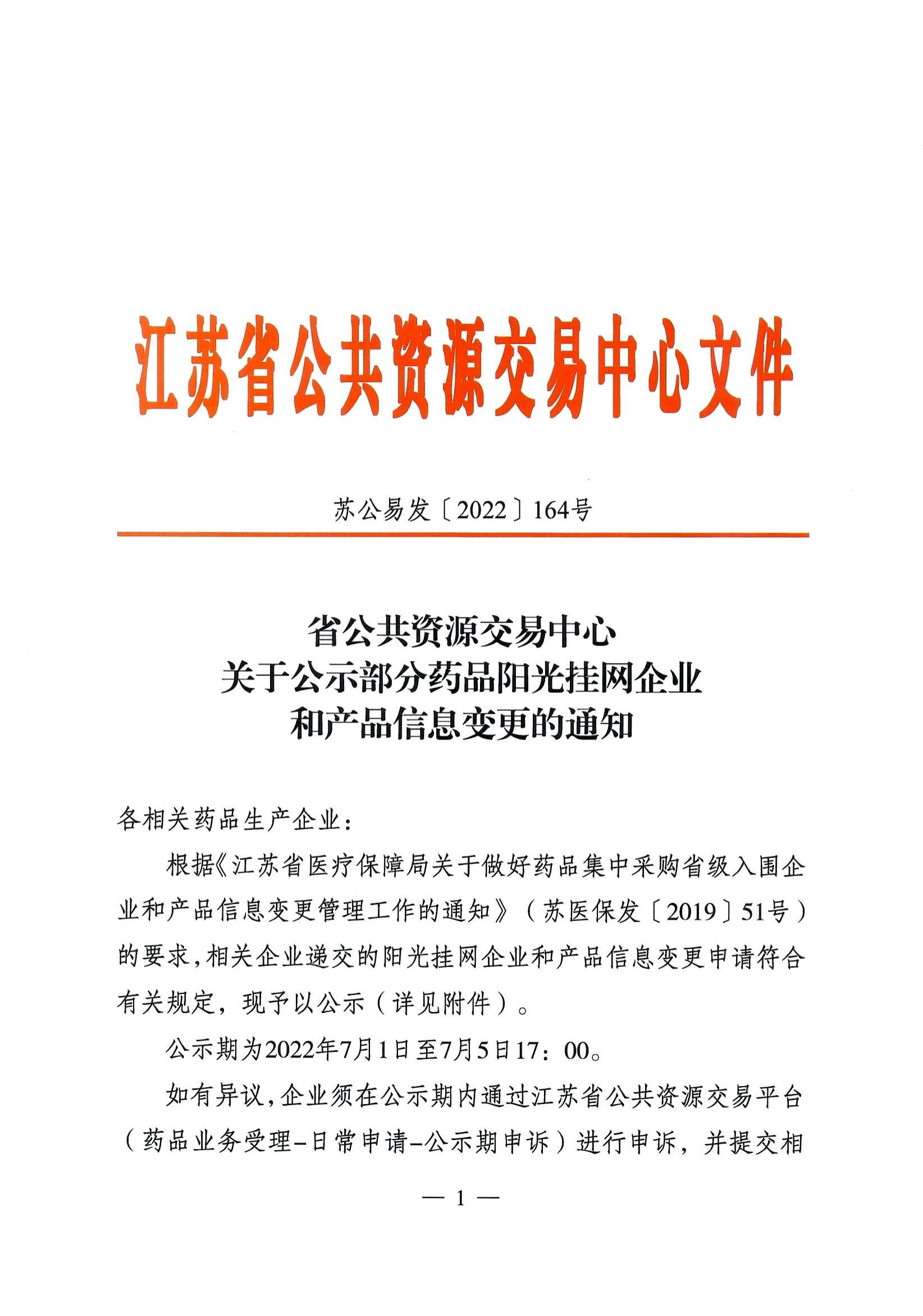【江苏】江苏省省公共资源交易中心关于公示部分药品阳光挂网企业和产品信息变更的通知
