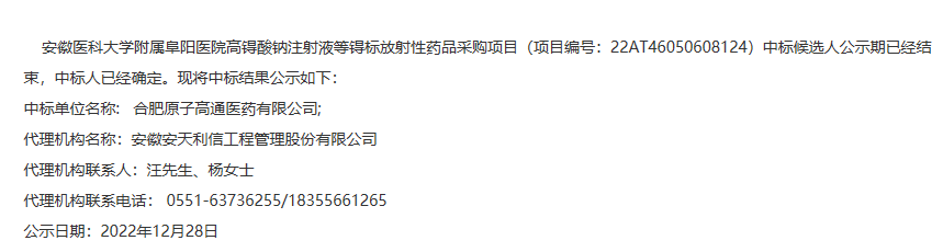 【安徽省科大学附属阜阳医院】安徽省科大学附属阜阳医院高锝酸钠注射液等锝标放射性药品采购项目中标结果公告