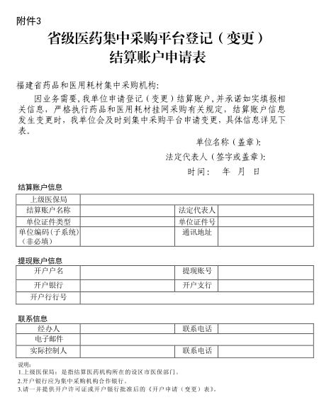 (1)省级医药集中采购平台登记(变更)结算账户申请表在福建招采子系统下载。