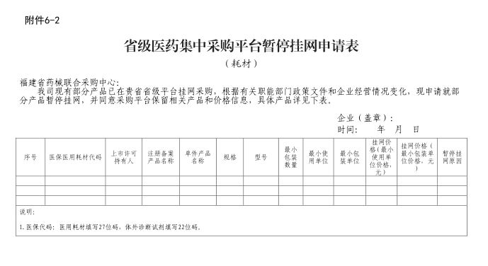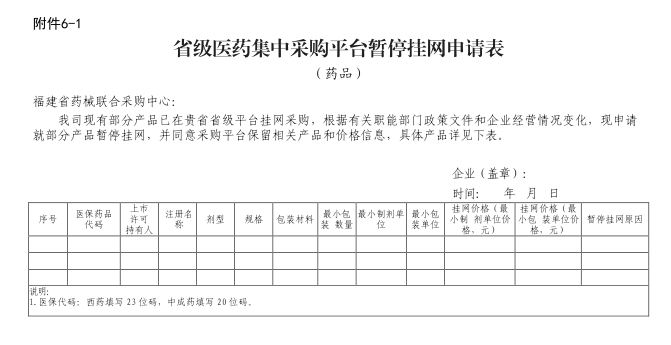 (1)省级医药集中采购平台暂停挂网申请表在福建招采子系统下载。