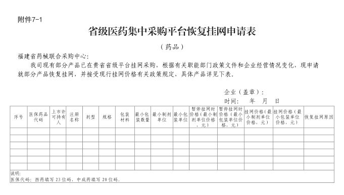 (1)省级医药集中采购平台恢复挂网申请表在福建招采子系统下载。