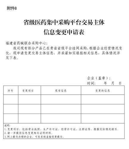 (1)省级医药集中采购平台交易主体信息变更申请表在福建招采子系统下载。