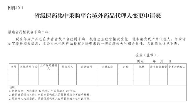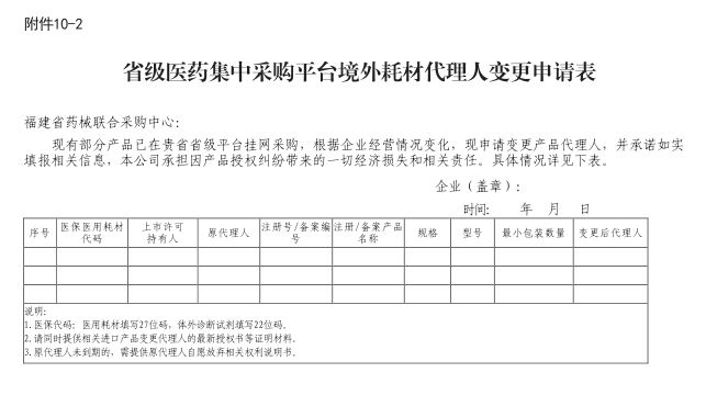 (1)省级医药集中采购平台境外药品耗材代理人变更申请表在福建招采子系统下载。