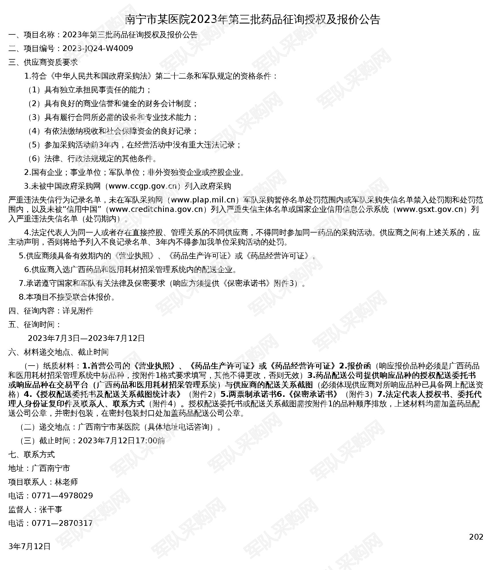 【南宁市某医院】军队采购网南宁市某医院2023年第三批药品征询授权及报价公告2023-JQ24-W4009