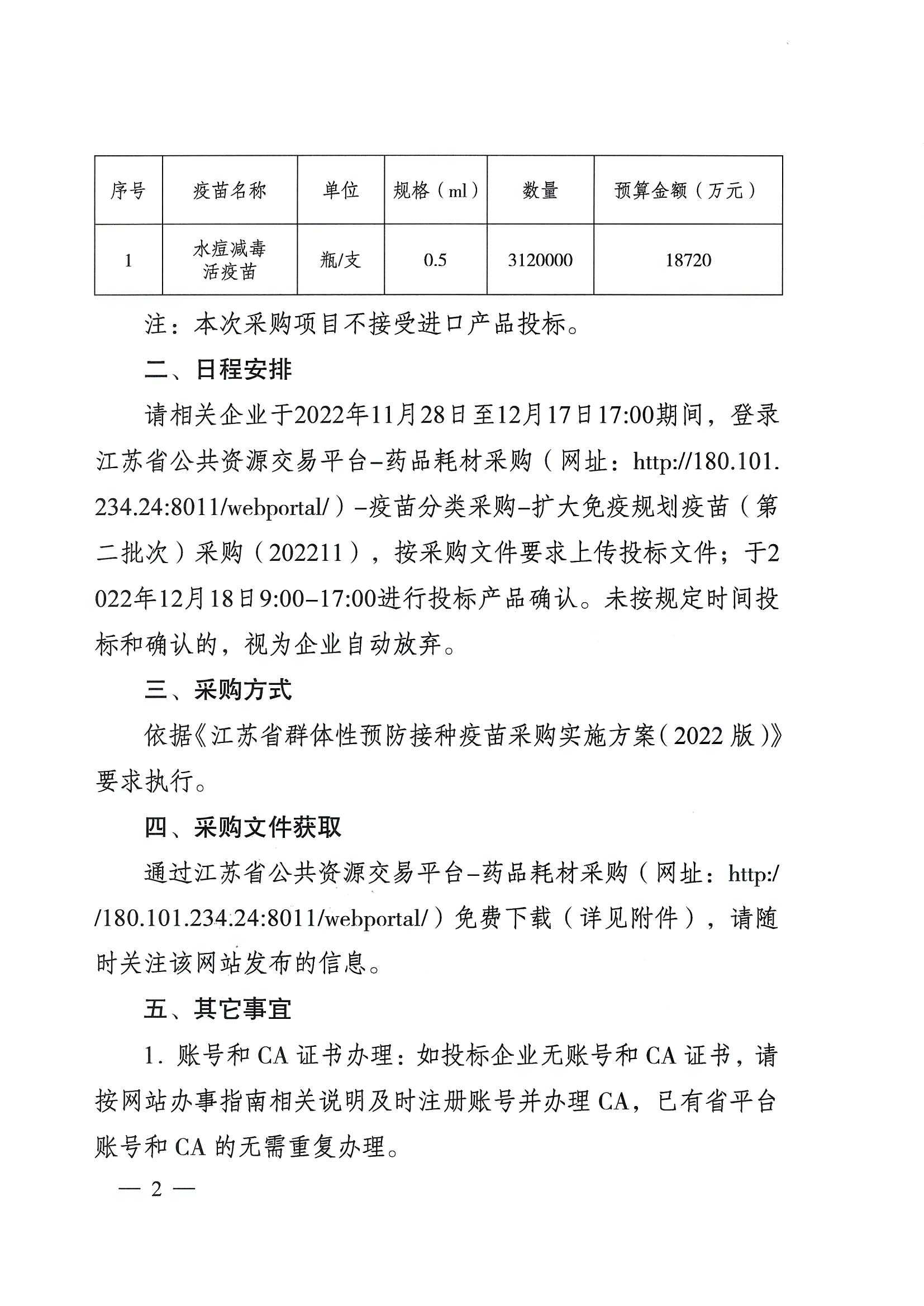 请相关企业于2022年11月28日至12月17日17∶00期间,登录江苏省公共资源交易平台-药品耗材采购(网址∶http∶//180.101. 234.24∶8011/webportal/)-疫苗分类采购-扩大免疫规划疫苗(第二批次)采购(202211),按采购文件要求上传投标文件;于2 022年12月18日9∶00-17∶00进行投标产品确认。未按规定时间投标和确认的,视为企业自动放弃。