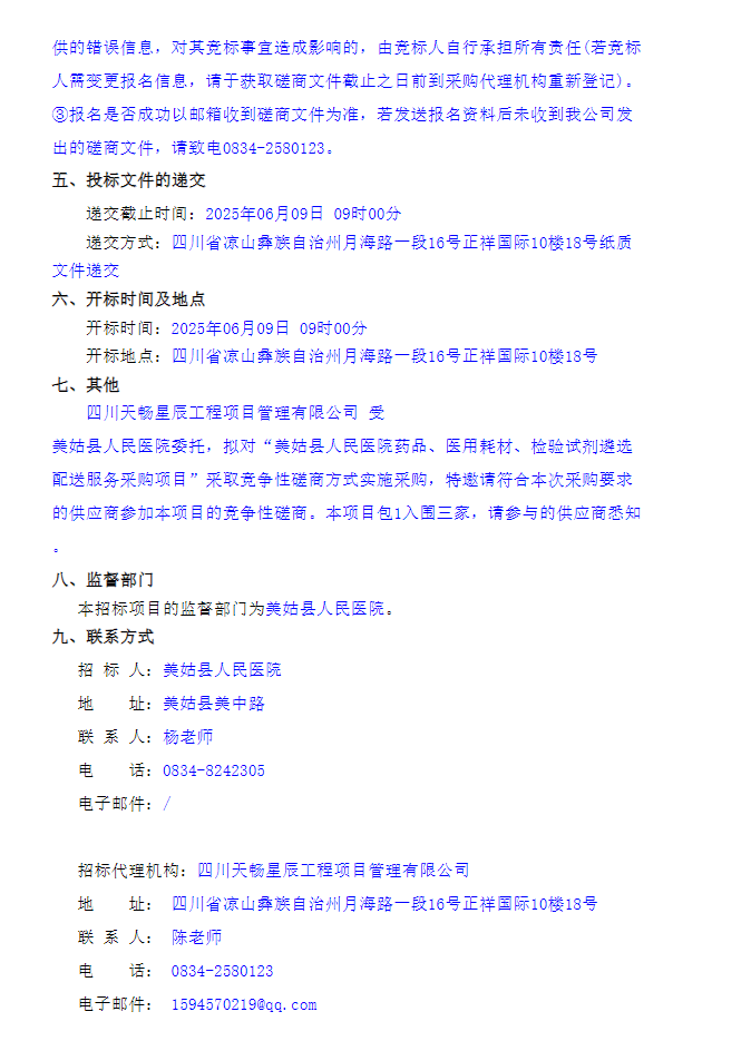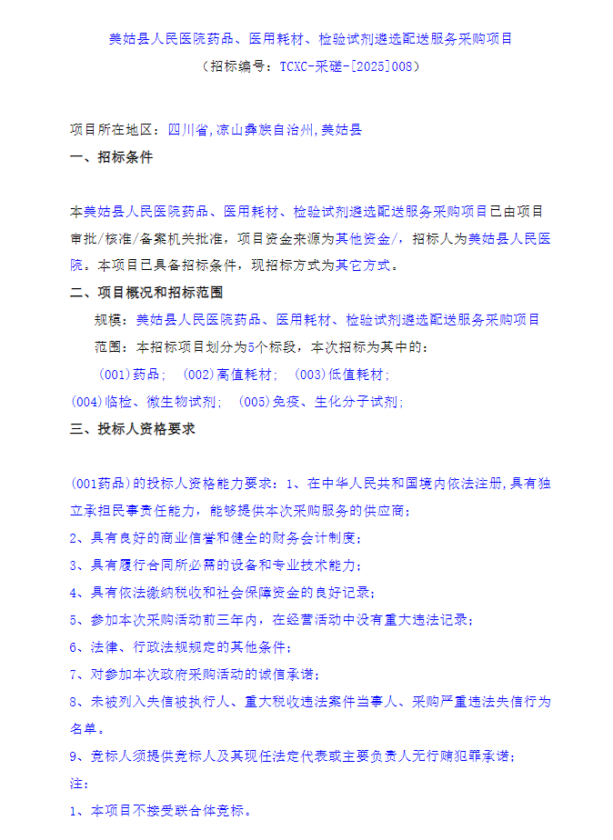 【凉山彝族自治州美姑县人民医院院标】四川省凉山彝族自治州美姑县人民医院药品、医用耗材、检验试剂遴选配送服务采购项目